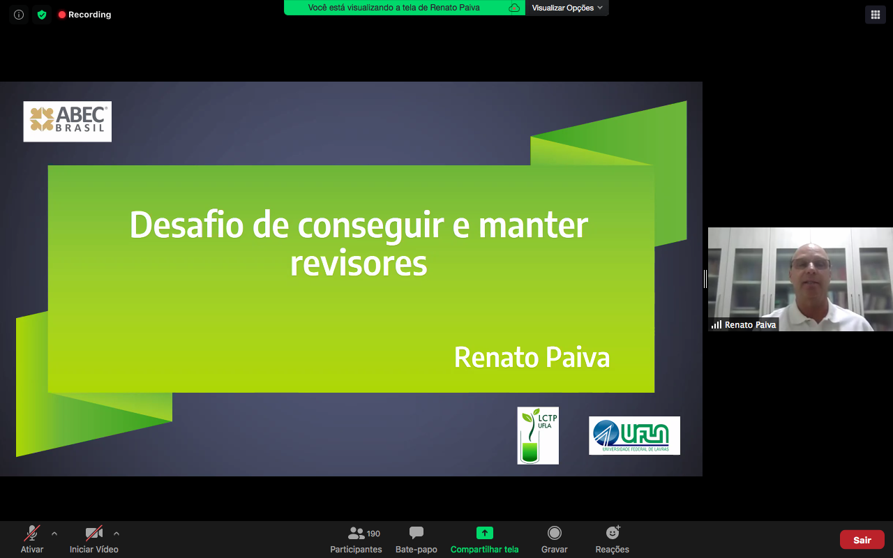 Renato Paiva, da Universidade Federal de Lavras (UFLA), tratou do “Desafio de conseguir e manter revisores”. “As dificuldades são normais. Mas precisamos superar as adversidades na busca e manutenção de revisores. Agradecer, informar sobre a publicação e referenciar a contribuição são algumas maneiras boas para isso”, elenca.